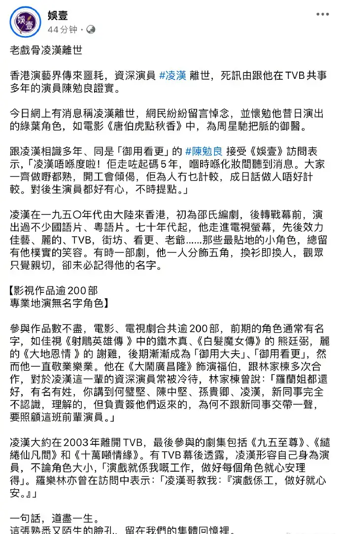 这场迟来5年的告别,满是令人唏嘘的低调。11月8日,与凌汉共事多年的TVB老友陈勉良在社交平台透露,凌汉其实早已离世,距今至少5年时间。